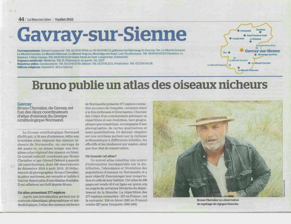Bruno Chevalier et Gérard Debout sont les co-auteurs de l'atlas des oiseaux de Normandie, paru cette année. La Manche Libre s'intéresse à Bruno qui n'est ni retraité ni à la recherche de cigogne dans le marais d'Annoville, comme il est dit dans l'article.