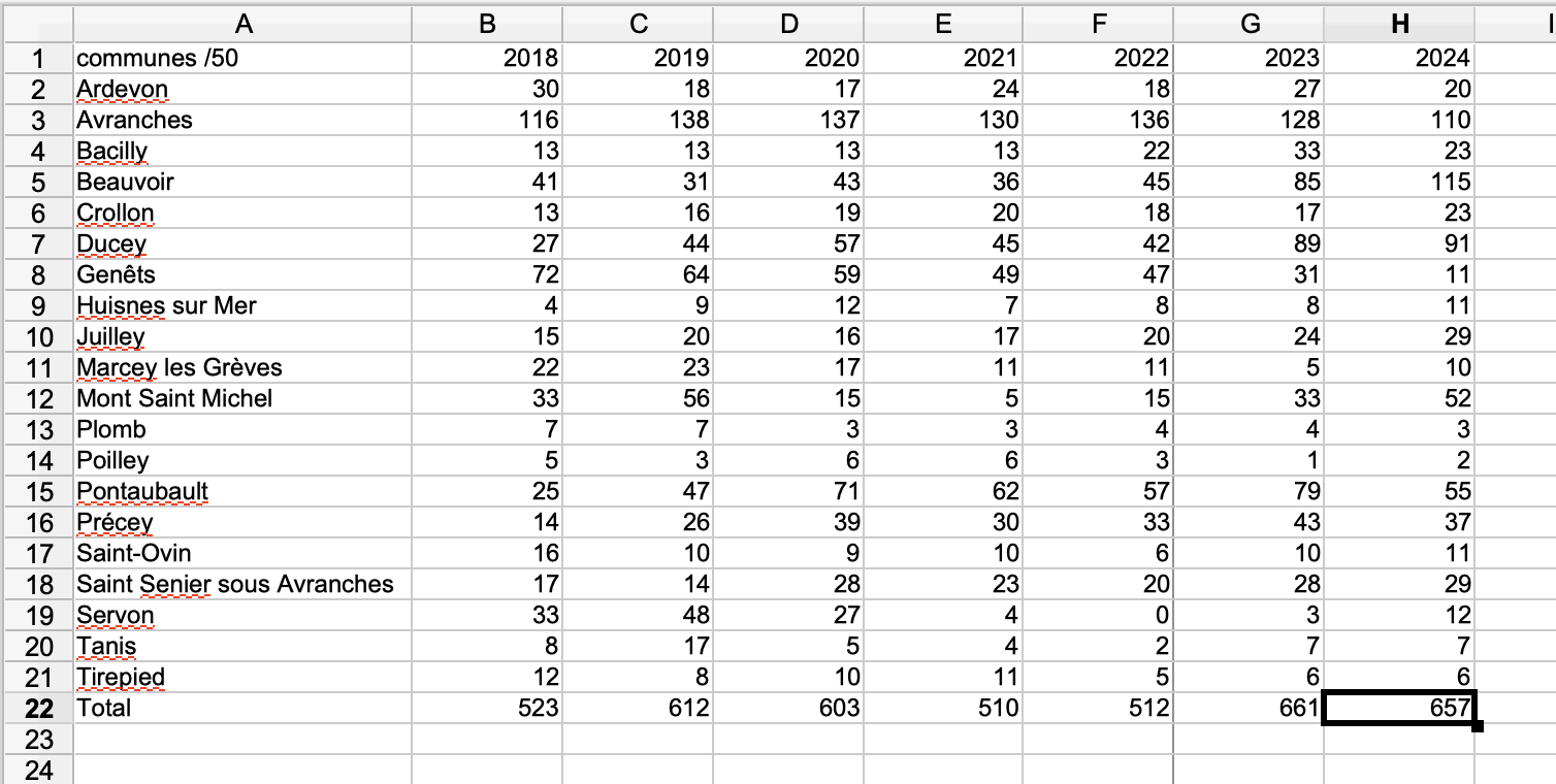 6 communes ont vu leur nombre diminuer dans des proportions parfois très importantes, - 30% à Pontaubault et Genêts (population divisée par 6 depuis 2018 !), -20% à Avranches où les fenêtres en bois du lycée Notre Dame ont été remplacées par des huisseries en PVC