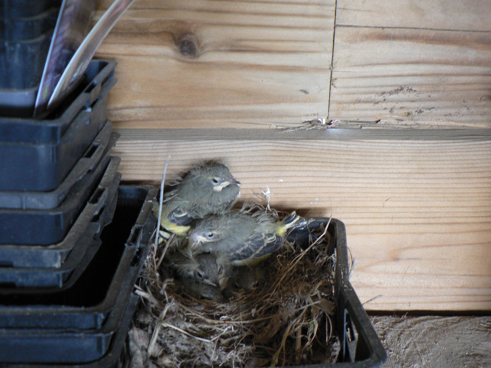 Bergeronnette des ruisseaux dans barquette plastique du jardinier; 2eme nichée, 5 jeunes, 1er juillet 2024<br />Photo Fanny Leprovost