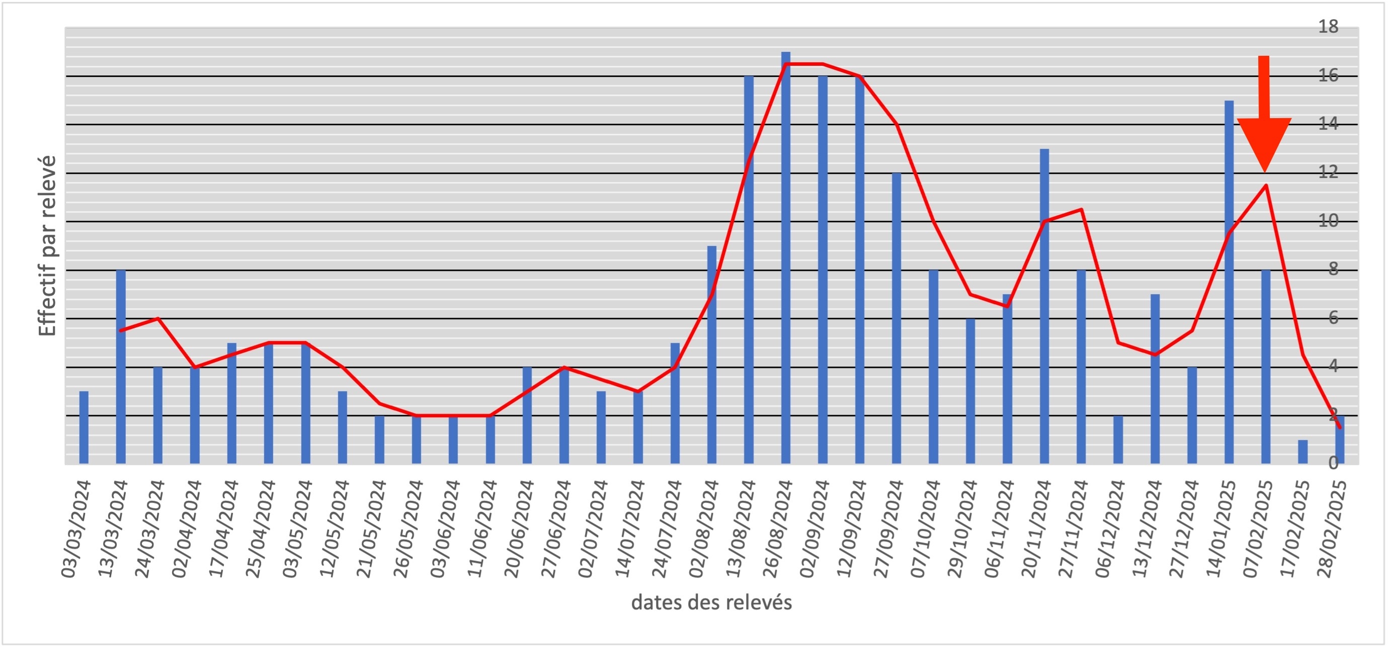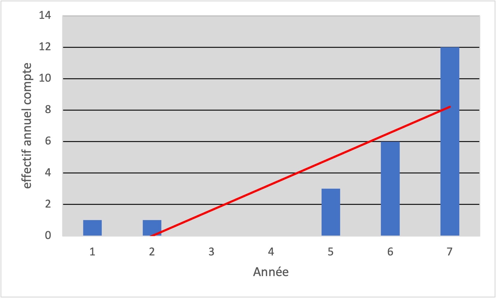 Sur les graphes suivants, "effectif compté" représente la somme de tous les individus notés au cours d'une année, le calendrier des relevés étant le même chaque année autorise la comparaison inter annuelle.