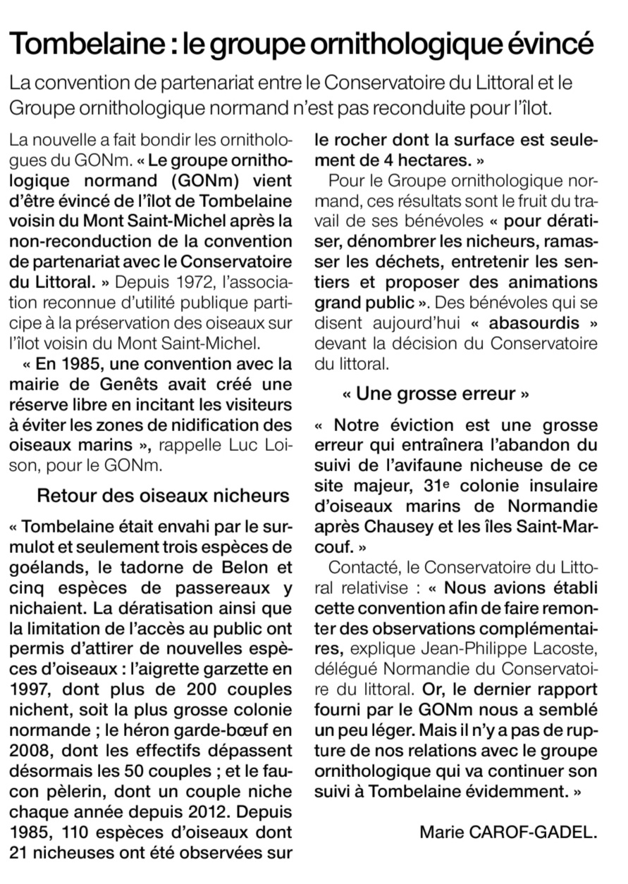 Après que le GONm a signalé par presse interposée son éviction de la gestion de la réserve de lîlot de Tombelaine, le Conservatoire du littoral veut rassurer, semble-t-il.
