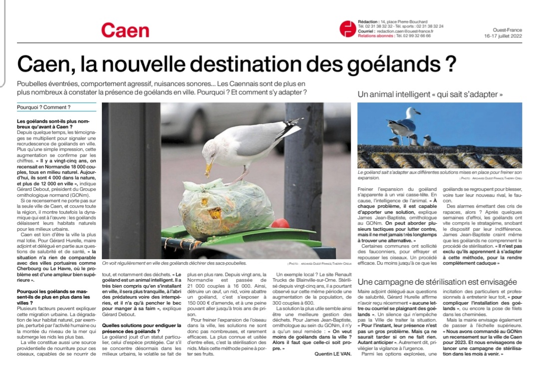 Les informations recueillies dans cet article par Ouest-France émanent du bilan 2021 sur les goélands nicheurs normands réalisé par le GONm et aussi des connaissances acquises par l'observation sur le comportement des goélands nicheurs urbains de Caen ou d'autres villes de la région.