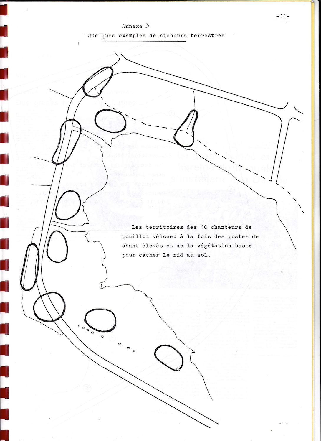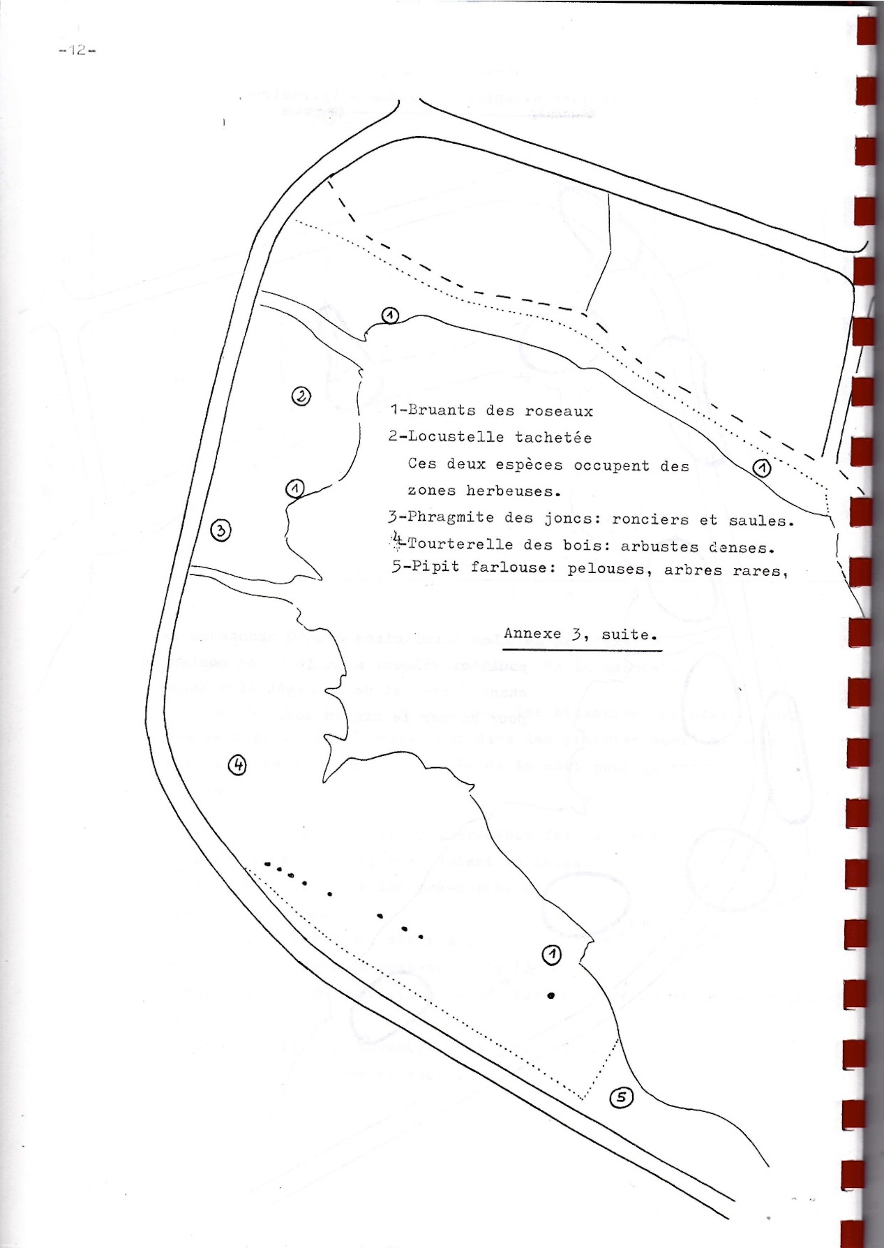 - La circulation depuis la route de ceinture se prête facilement au relevé des chanteurs cantonnés. A la fin des années 1980, la saulaie n'est pas encore aussi mature qu'actuellement comme le prouve par exemple l'installation du phragmite des joncs, de la locustelle ou du bruant des roseaux cette année 1989.