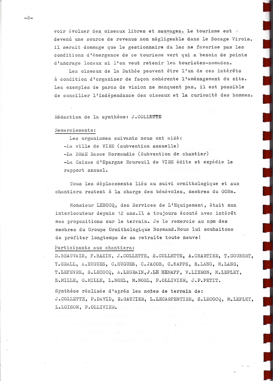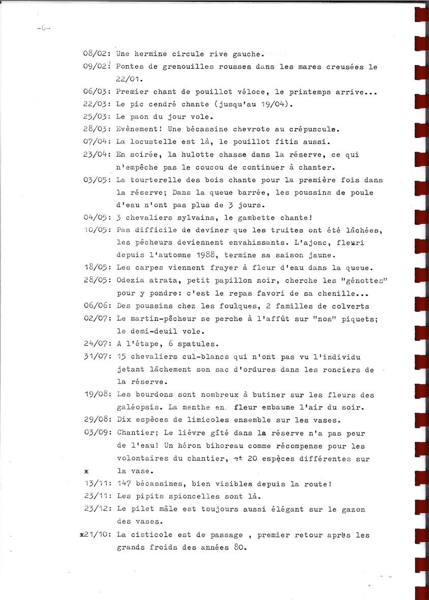 Ce document d'archive est publié in extenso de façon à faire comprendre comment à la fois un réseau d'observateurs et de participants aux chantiers s'est monté sur un site finalement de petite taille, mais aussi comment le GONm a pu créer des liens constructifs au sein de la collectivité viroise (élus, associations, établissements scolaires, bibliothèque, presse locale...) alors que nous avions peu ou pas de relais locaux, ce handicap étant resté un frein encore actuellement au bon développement de la réserve.
