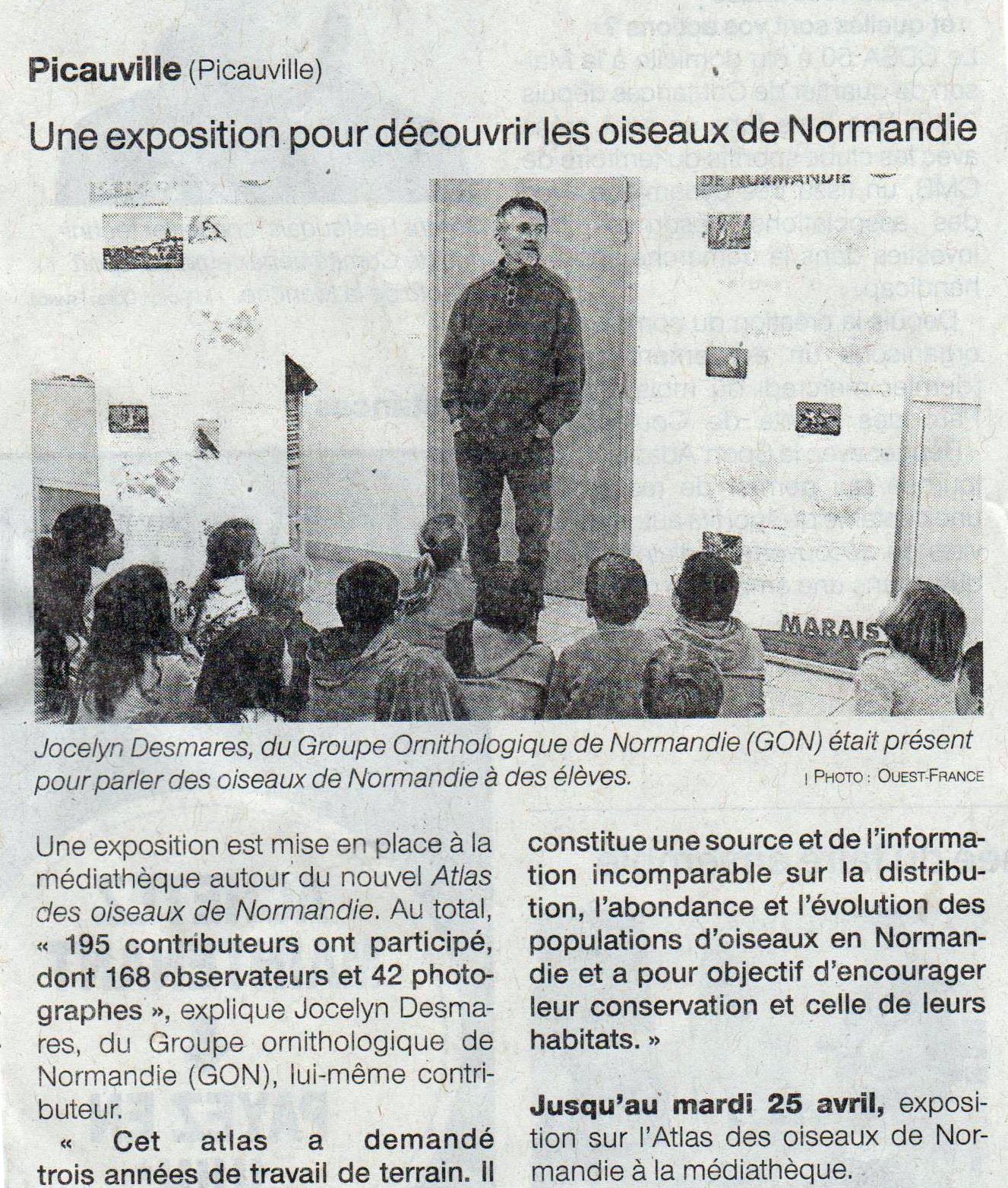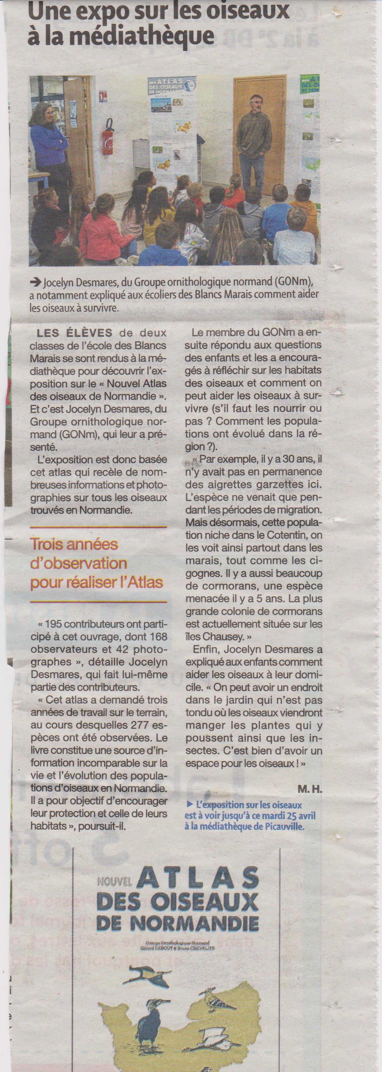 La présentation de l'expo-atlas du GONm à la médiathèque de Picauville/50 a permis l'intervention de Jocelyn Desmares, bénévole du GONm dans 2 classes de l'école publique de la commune. Il a pu présenter les résultats de l'atlas et répondre aux questions des élèves sur les oiseaux.