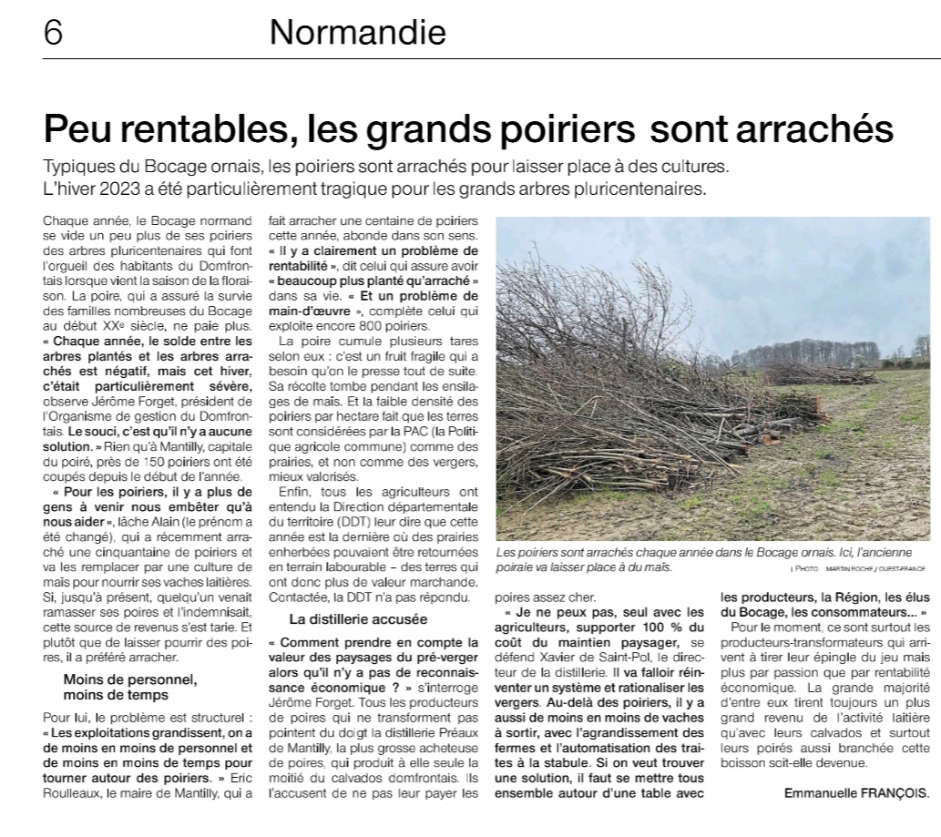 Une perte énorme pour la biodiversité que la destruction de vergers de poiriers dans le Domfrontais. On n'ignore pas la richesse de ces plantations pour l'avifaune et autre vie sauvage.