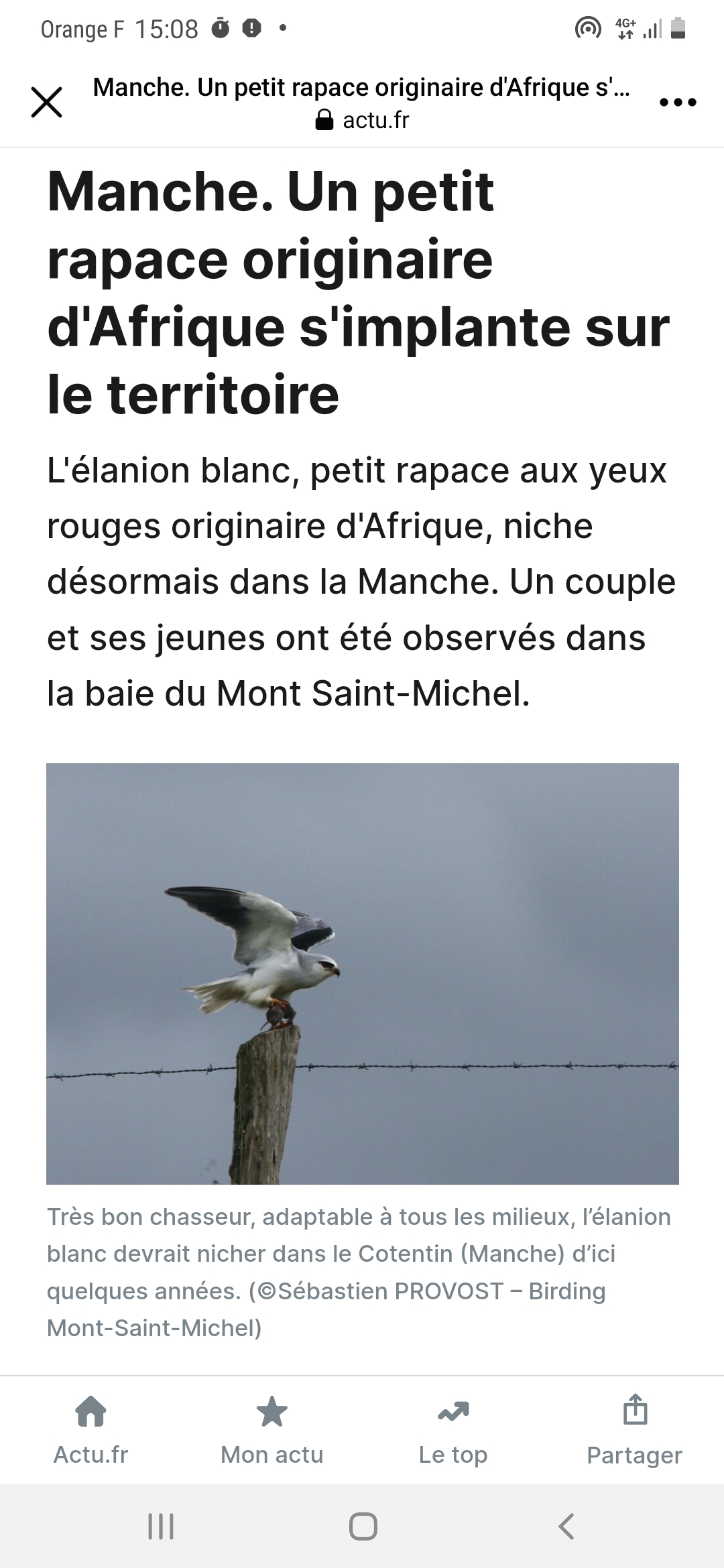 Même si la nidification de l'élanion blac a été remarquée l'an passé, elle apparait aujourd'hui de façon officielle dans la presse, mais numérique dans Actu.fr.