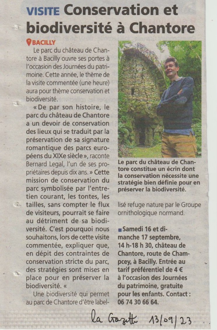 Le parc du château de Chantore (Bacilly/50) est un des joyaux du réseau des refuges du GONm. Il est ouvert à l'occasion des Journées du patrimoine; le thème choisi par les propriétaires nous concerne : comment concilier conservation et biodiversité?
