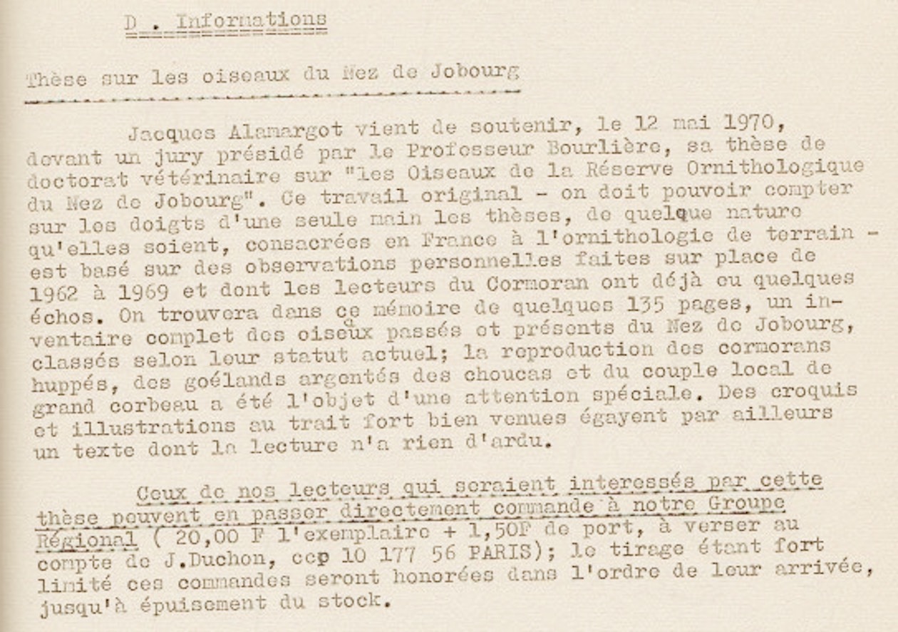 Cette annonce parue dans le numéro 3 de la revue avait quelque chose d'exceptionnel : une réserve ornithologique normande comme sujet de thèse vétérinaire! Le "virus" n'a jamais quitté Jacques... Voir le lien pour un message dédié à 152 (1).
