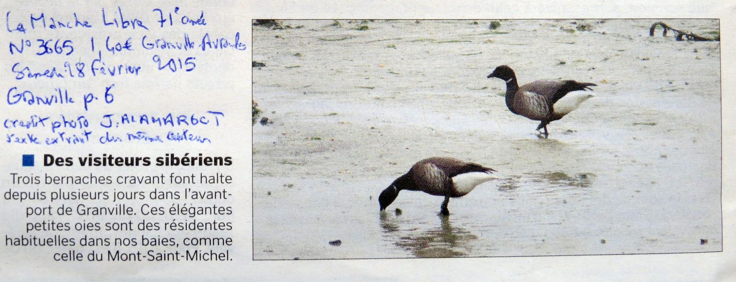 Notre vigilant collègue Jacques a informé la Manche Libre de la présence inhabituelle, si ce n'est inédite, de bernaches cravants dans l'avant-port de Granville. Il avait fourni à ce journal photos et texte. Il n'y avait plus qu'à publier. Déception : le texte fourni a été tronqué. Le forum le restitue dans son intégralité .