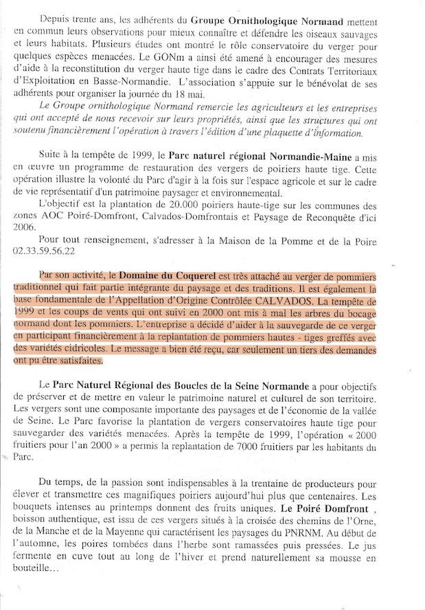 Le 18 mai 2003 se tint la première édition de nos dix années d'animations concertées de printemps sur le thème des oiseaux des vergers traditionnels normands. Premier coup d'essai, un week-end sur 31 sites. Il fallait un document support accompagnant les commentaires des animateurs. Une plaquette fut éditée, tirée à 5 000 exemplaires, comme tous les ans par la suite. Problème du financement... Contacté, le directeur de cette entreprise, Monsieur J.F. Martin, donna tout de suite son accord pour participer. Sa motivation avait été repérée dans la presse locale : le Domaine de Coquerel avait offert à ses producteurs des plants de remplacement des pommiers haute tige abattus par l'ouragan de décembre 1999. J'avais manifesté par courrier la satisfaction du GONm au vu de cette démarche qui consolidait le verger normand à une époque où les produits cidricoles n'étaient pas économiquement dynamiques.