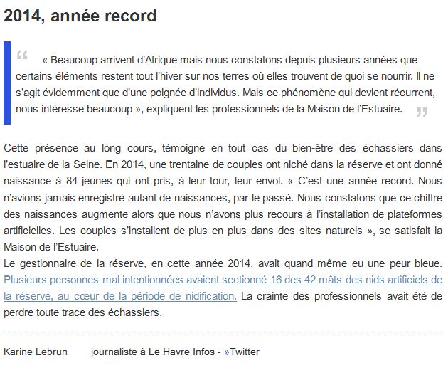 Dans Paris-Normandie numérique, un article annonce le retour des cigognes sur leur site de nidification de la réserve de naturelle de la Seine. Il rappelle à bon escient qu'en 2014, 16 mâts des plates-formes supportant les nids avaient été abattus par des personnes "indélicates". L'enquête suit son cours ...