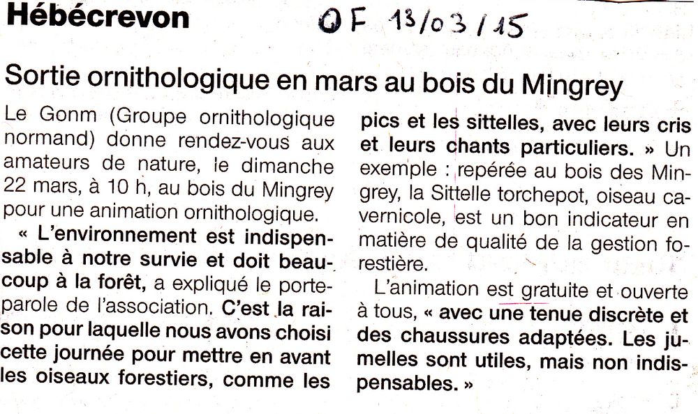 Une visite ouverte au public est proposée le 22 mars 2015 à Hébécrevon, bois du Mingrey . RV à 10h sur le parking situé à l'entrée du bois. A Saint-Gilles, prendre la D446, direction Hébécrevon.