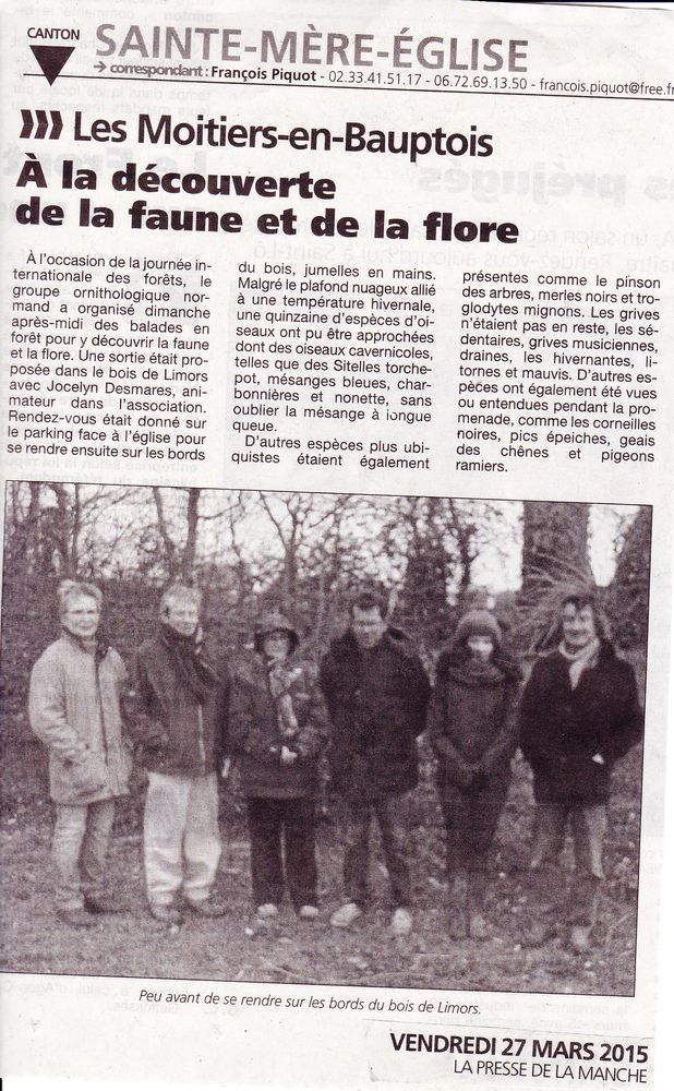 Au bois de Limors, La Manche Libre et la Presse de la Manche étaient là, malgré les élections, pour l'animation menée par Jocelyn Desmares . A noter que l'auteur de l'article s'appuie souvent sur les documents fournis par le GONm. Cette documentation est souvent précieuse et permet de cadrer le propos ( voir doc 195).