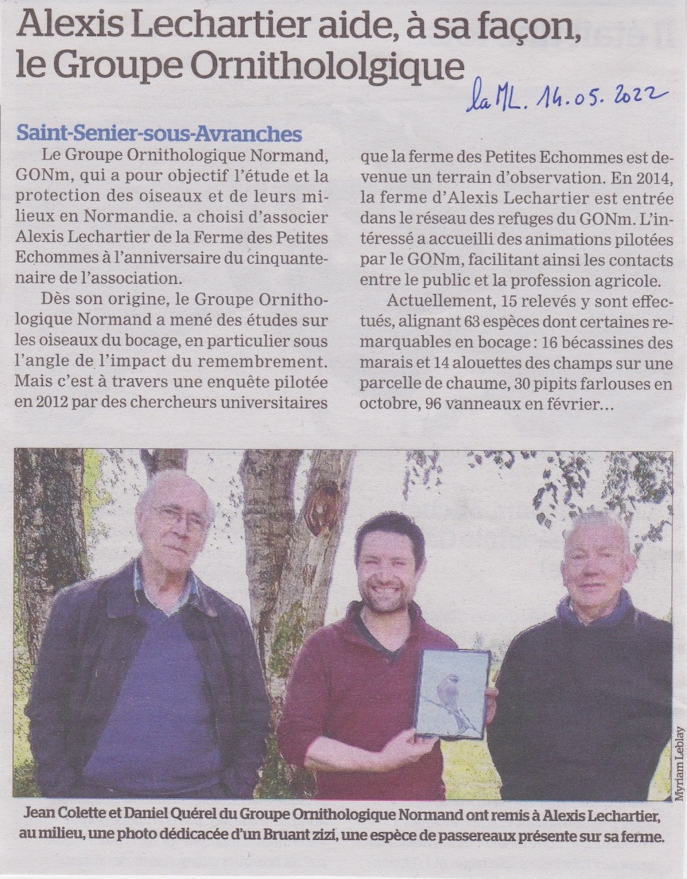C'est par lui que nous avons commencé à nouer des relations privilégiées avec des agriculteurs bio : Adrien Lechartier participait à une expérience nationale ("Indibio") et nous avons couvert l'enquête pour la partie ornithologique sur sa ferme de Saint-Senier aux portes d'Avranches. Depuis, Adrien est bien connu localement (et même au-delà), ayant développé une entreprise de transformation de produits lactés bio avec un autre producteur bio local (produits "Pivette et Palorette" du nom des deux ruisseaux qui traversent les deux fermes).