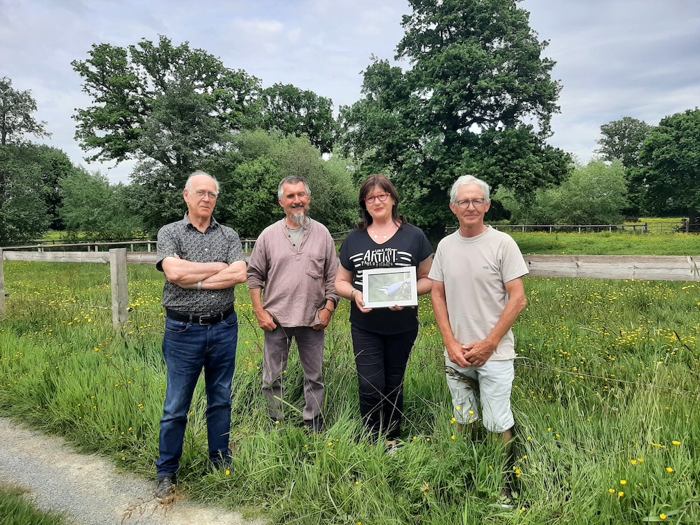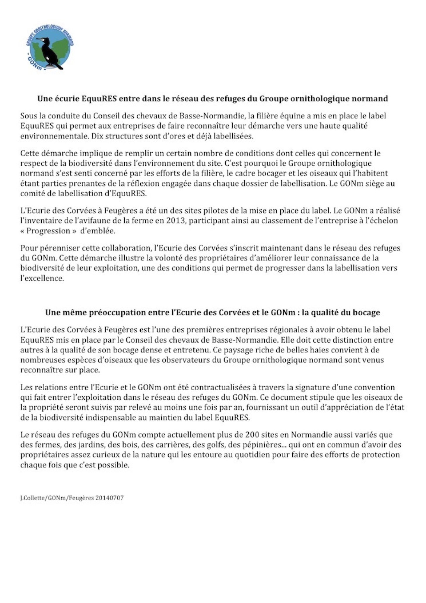Quand la filière équine organisée au sein du Conseil des chevaux de Normandie a mis en place un label s'appuyant sur la préoccupation du bien-être des animaux et le respect du cadre et des activités liées à l'élevage, le GONm a été contacté pour participer à la mise en place des mesures concernées par le paysage et la biodiversité (bocage, eau et zones humides,bâtiments...) Nous avons donc été mis en relation avec les éleveurs pionniers pour mettre au point les actions qui ont été retenues par la suite. A Feugères /50, Philippe Gachet et moi même avons rencontré à cette occasion Monsieur et Madame Raulline. Les bonnes relations nouées ont par la suite débouché sur la signature d'une convention refuge. Nous avons été heureux de les remercier en venant à leur rencontre à l'occasion de nos 50 ans et en leur offrant une photo de sittelle (oeuvre de Jacques Rivière) vu la qualité des haies de leur bocage.