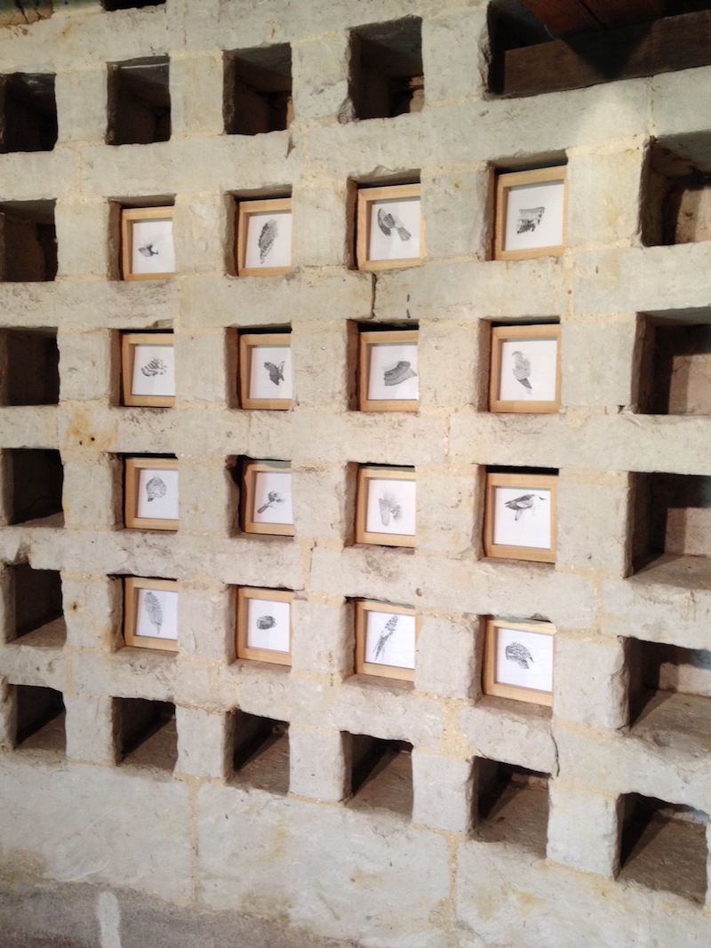 Le haras de Préaux est entré dans le réseau des refuges en mai 2014, le propriétaire Monsieur Lucas ayant choisi d'adhérer. Notre collègue Sophie Akermann en charge des comptages est plus concernée par le réseau des haies que par le pigeonnier du 16e siècle. Mais d'autres visions de l'oiseau ont occupé les niches du pigeonnier en juin dernier. L'artiste Héloïse Guyard a exposé des oeuvres s'appuyant sur la plume et l'oiseau. Exposition brève d'oeuvres parfois éphémères... Il faudra aller à l'île d'Yeu en août pour admirer ces plumes d'un autre genre.