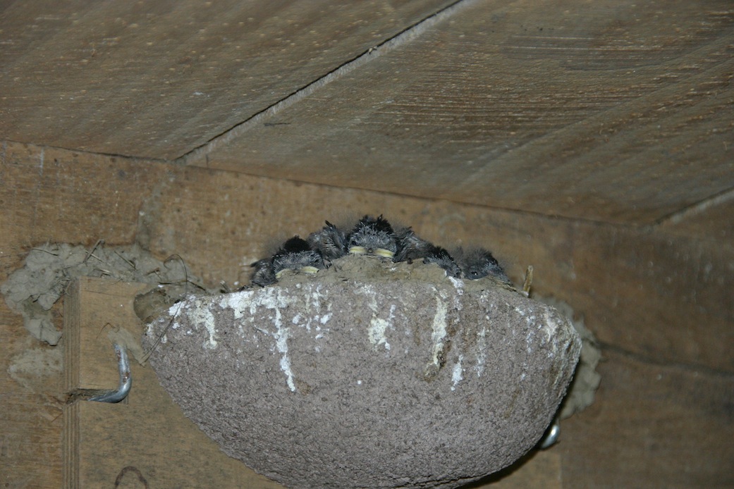 Aux Cresnays/50, chez Agnès, le couple (irrégulier) d'hirondelle rustique est moderne : il préfère le nid artificiel pour pondre... Il faut dire qu'il leur a suffit d'ajouter un vague ourlet de terre au bord du béton pour personnaliser le nid! Quatre jeunes se sont envolés les 20 et 21 juin d'après la fiche de nid. Les adultes utilisent le nid "naturel" pour dormir à côté des jeunes. Encore a t-il fallu décourager le troglodyte de service qui avait bien l'intention de squatter les lieux!