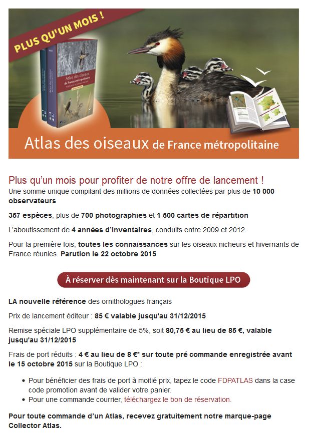 Cet atlas auquel les observateurs du GONm ont participé de façon intensive est en vente en souscription auprès de la LPO. L'ouvrage semble monumental et le prix est à la hauteur. La remise sur la souscription est modeste mais cela vaut le coup de se procurer ce passionnant ouvrage. Le dernier atlas national le "Yeatman" datait de plus de 25 ans (1985-1989)