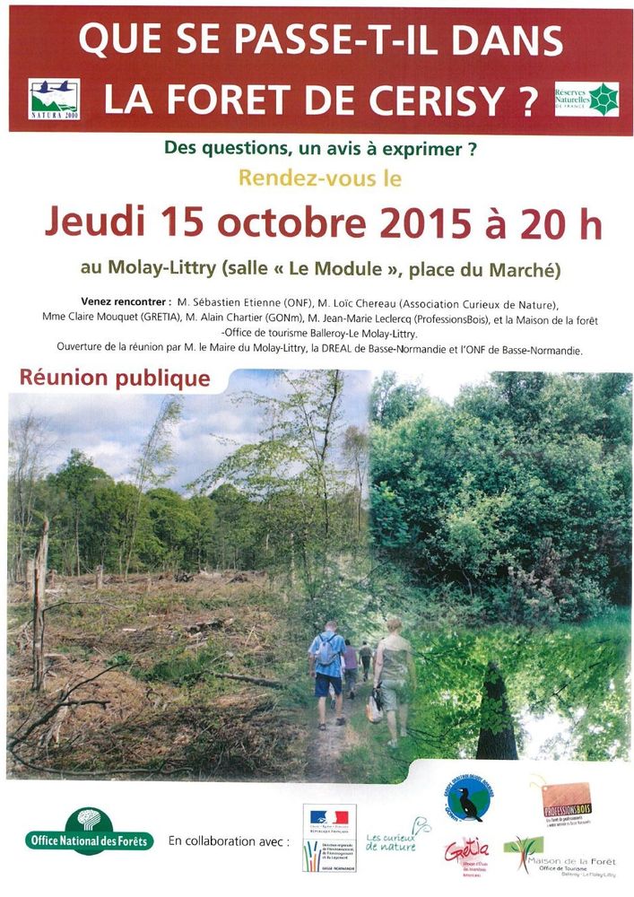 Le GONm ainsi que d'autres associations comme le GRETIA et les Curieux de Nature et des organismes comme l'ONF, Profession Bois et la Maison de la Forêt participeront à cette réunion publique d'information et d'échange sur la forêt de Cerisy. Cette réunion se tiendra, comme indiqué sur l'affiche ci-dessous, dans la salle du Module au Molay-Littry/14.