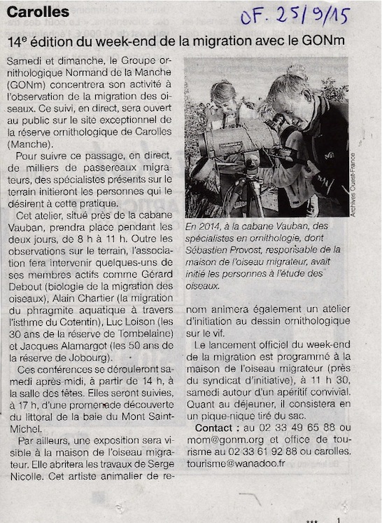 L'animation GONm prévue à Troisgots, la Chapelle sur Vire/50, samedi 19 septembre, est annoncée dans la page consacrée aux journées du patrimoine dans le gratuit "Côté Manche". Le communiqué transmis à la presse évoquait le faucon pélerin, oiseau nicheur dans ce secteur de la vallée de la Vire. D'où la photo de Sébastien Provost (pas cité).