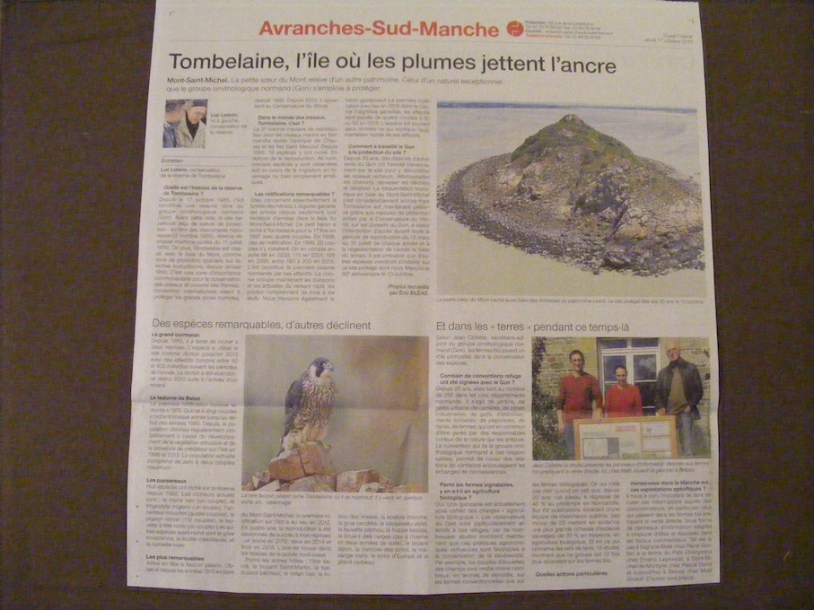 Trop grande pour être scannée... Ouest-France donne une belle place au GONm aujourd'hui 1er octobre : l'anniversaire de la réserve de Tombelaine et un ajout sur la démarche du GONm vers les fermes bio en refuge.