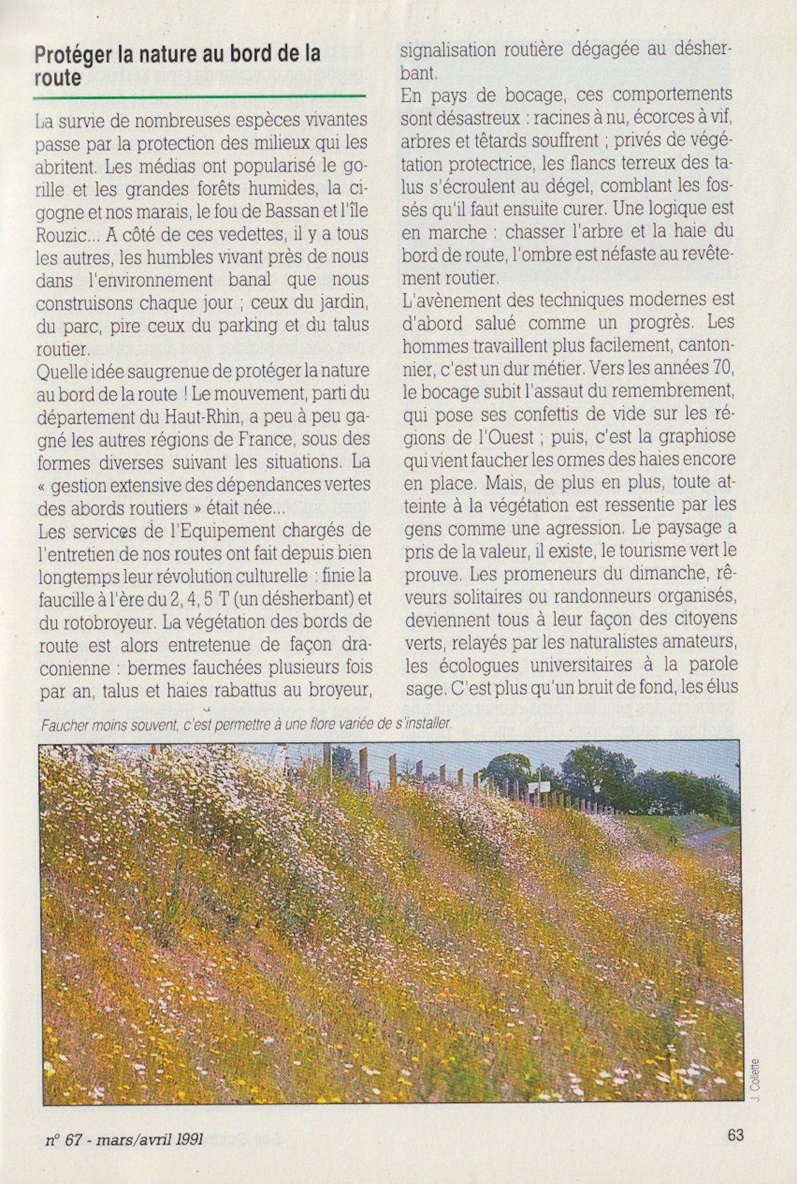 Trente deux ans plus tard, le même article pourrait être publié à nouveau, à la différence que de nombreux kilomètres de rives boisées ont disparu de nos routes, les "rotors à fléaux broyeurs" ayant peu à peu servi de "déboiseurs" sournois en détruisant année après année les rejets des souches finissant par mourir... 1991 03 00- le Petit Ramoneur- bords de routes- Les Quatre Saisons du jardinage-