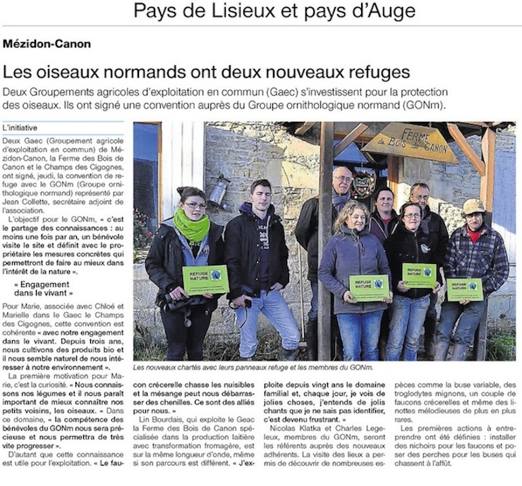 Cet article de Ouest-France anticipe la création de deux nouveaux refuges à Mézidon dans le Calvados et dispense quelques généralités sur le GONm. C'est l'occasion d'informer sur les actions de protection des oiseaux menées par le GONm à travers ses réserves et ses refuges.