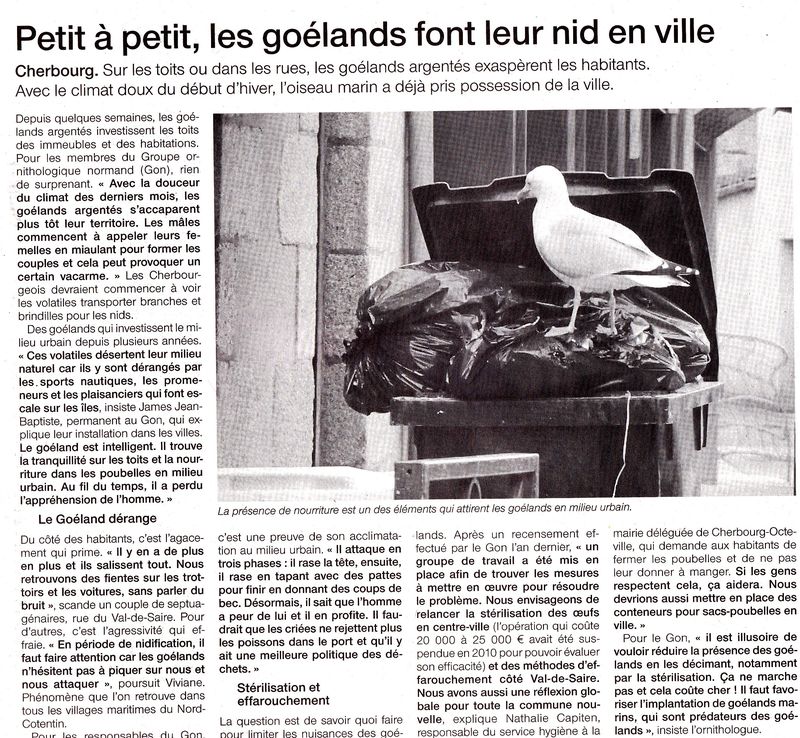Cette année, avec cet air de printemps, la pression est plus précoce. L'article de Ouest-France ne crie pas haro sur le baudet et publie un article équilibré et documenté.Le GONm fournit une partie des informations. Comme il est dit dans cet article, alors que la mairie de Cherbourg envisage à nouveau la stérilisation des oeufs,la position du GONm ne varie pas . Le souci de précision du rédacteur ajoute deux encadrés livrant des informations chiffrées sur les populations de goélands et leur évolution à Cherbourg et en Normandie. Erreur : 2500 couples de goélands, c'est le nombre de couples perdus en dix ans en Normandie.