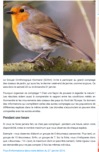 Nous signalions le nombre restreint d'articles de presse annonçant le grand comptage des oiseaux de jardin. Rattrapage dans l'édition calvadosienne de Ouest-France qui produit un article bien complet sur le sujet mais après les dates prévues! Dommage!