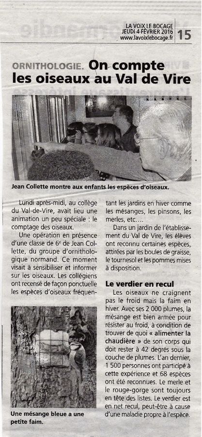 A la demande d'un professeur du collège Val de Vire, Jean Collette a proposé une animation labellisée Grand Comptage des Oiseaux de Jardin pour des élèves d'une classe de 6ème. Le rédacteur de l'hebdo local "La Voix Le Bocage" n'est pas très précis quand il parle d'expérience à propos du grand comptage : manque d'espace peut-être? On attribuera l'erreur sur la dénomination du GONm à une faute de frappe.