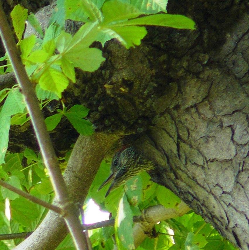 Pas besoin d'aller bien loin pour faire des découvertes. Il suffit parfois de lever la tête. Maryse a découvert ce nid de pic vert dans son jardin, dans un marronnier. Le jeune est ici près de s'envoler.