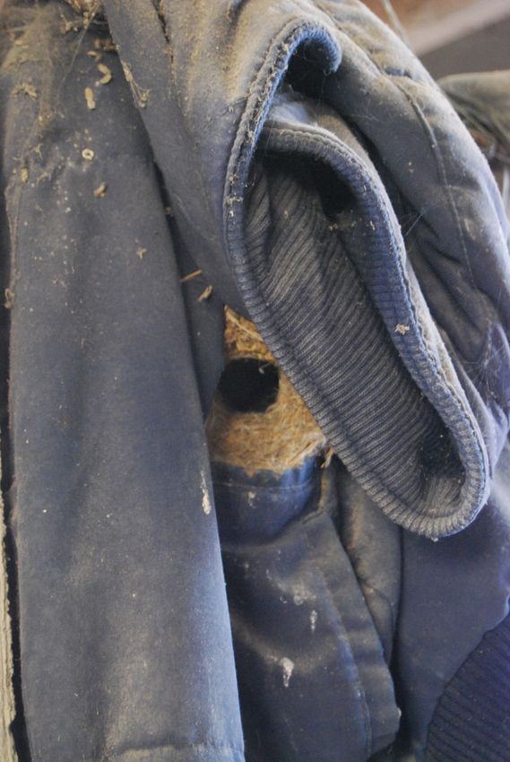 Le troglodyte a quand même le génie de l'installation bizarre ou du n'importe quoi, on ne sait pas trop. On connaissait déjà la poche de veste inutilisée : en voilà un exemple repéré par Régis Purenne à Saint-Marcouf. Le troglodyte avait niché dans la même poche de la même veste, il y a deux,trois ans.