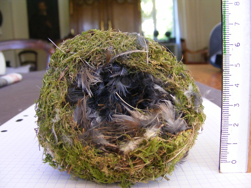 Un nid tombé au pied d'un résineux (essence non spécifiée) et confié à la sagacité des ornithos par le voisin... Tout de mousse bâti, plus quelques lichens, intérieur complet en plumes, mais une queue de plus de 20 cm! Plus fort que la rousserolle effarvatte...