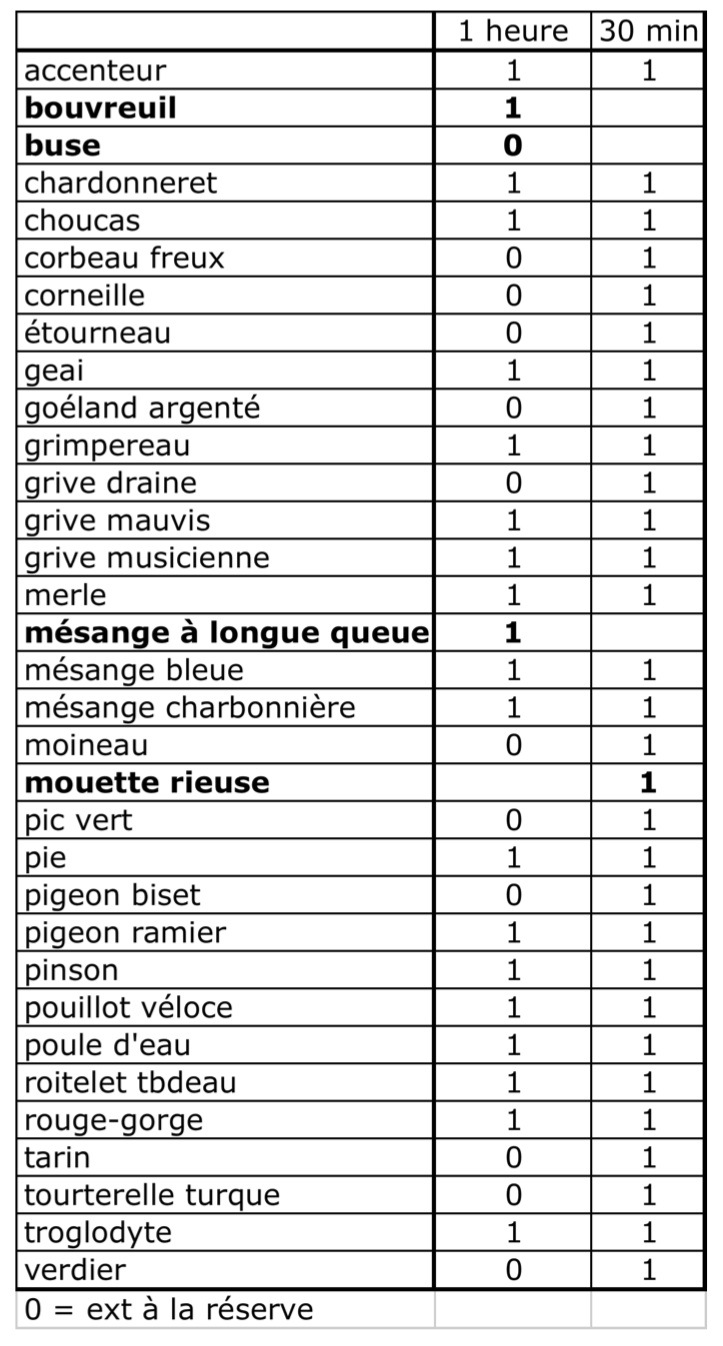 Le relevé général d'une heure (8h05-9h05) couvre partiellement le créneau de Tendances (8h40-9h10); au total, 33 espèces ont été notées, 30 pour les 30 minutes de Tendances, 32 pour le relevé d'une heure. Seules 4 espèces ne se retrouvent pas dans les deux listes : la mouette rieuse, la buse, le bouvreuil et la mésange à longue queue.