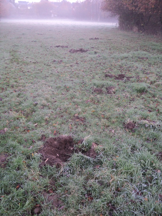 Cette nuit, un sanglier est passé jardiner le pré. Il cible particulièrement le sol sous les bouses de vache probablement plus riches en proies potentielles.