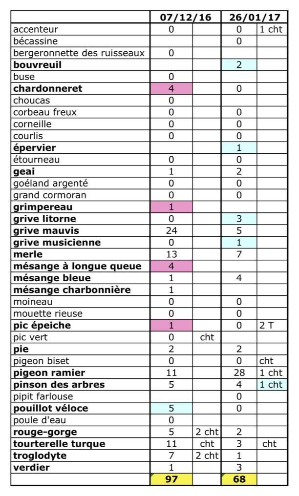L'abondance brute passe de 97 à 68 individus. Liste complète de 34 à 30 espèces.