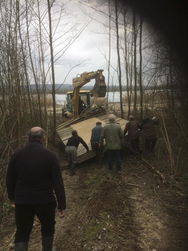 À la mi-Mars, quelques bénévoles de l’Eure, 2 salariés du GONm et 3 du secteur espaces verts de la base de loisirs de Lery-Poses-en-Normandie se sont retrouvés sur la réserve pour leurs mises à l’eau. Le « Lands ‘art », d’une tonne, a pu être acheminé au bord de l’eau à l’aide d’un tractopelle et à l’extrême précision du salarié conducteur d’engins. Après, notre mission a consisté à regrouper les radeaux temporairement face à l’observatoire aux mouettes afin de nous faciliter la tâche pour leur mise en place définitive (il ne fallait pas les mettre trop tôt en place de façon à éviter que les mouettes ne s’y installent avant l’arrivée des sternes).