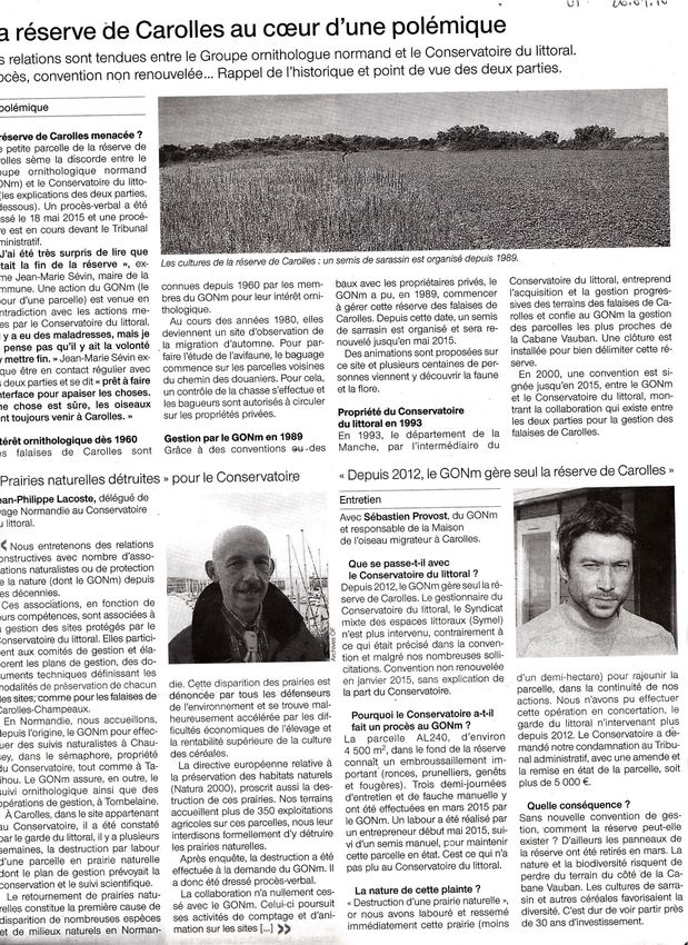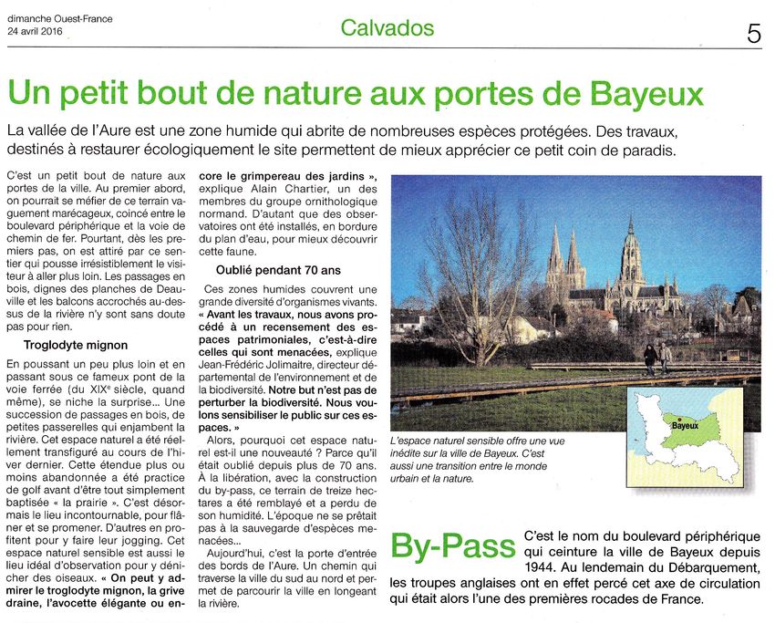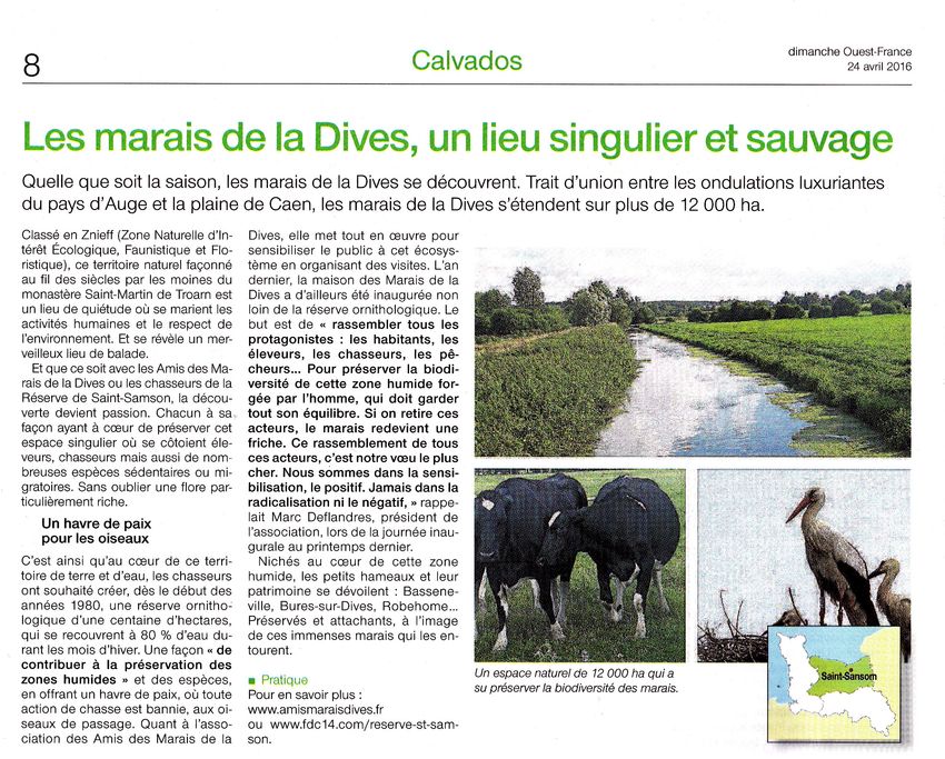 Le 24 avril 2016, un numéro spécial de Ouest-France propose des balades en Normandie sur des sites particuliers, présentant un intérêt architectural ou environnemental. Plusieurs lieux bien connus des ornithos sont présentés comme la Pointe du Siège à Ouistreham, le marais de Colleville-Montgomery, le Marais du Grand Hazé, Tatihou et Chausey, entre autres.