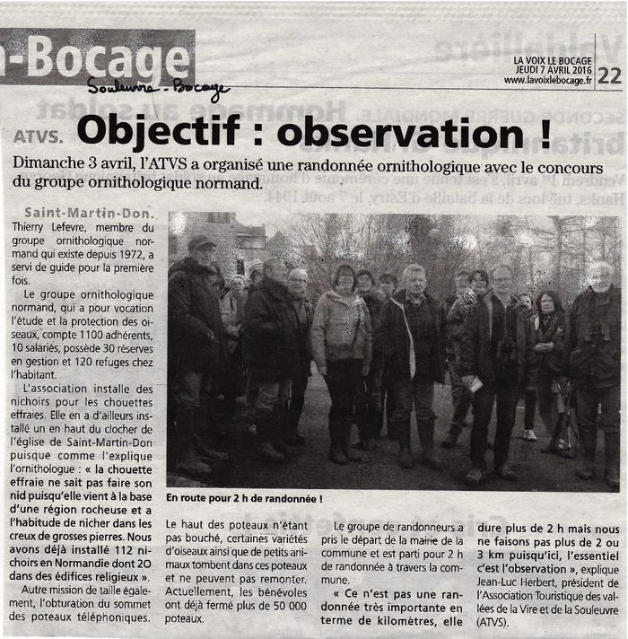 L'association touristique des vallées de la Vire et de la Souleuvre organise chaque année une randonnée ornithologique aux abords et dans la réserve de Montanglier/14. Thierry Lefèvre du GONm animait cette sortie le 3 avril 2016.