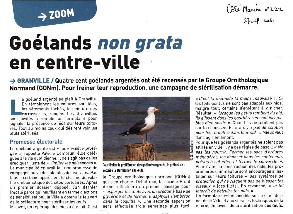 Les opérations de stérilisation des oeufs de goélands argentés ont bonne presse. Ci-dessous un article du gratuit "Côté Manche" avec une erreur de distibution sur la photo!