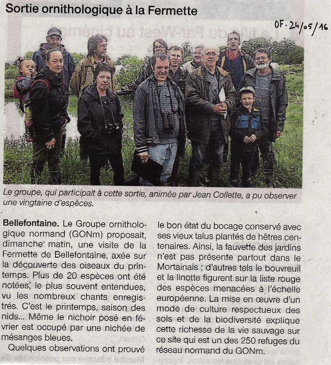 La fête de la Bio, organisée par le GAB50 'Groupe Agriculture Biologique", avait lieu les 28 et 29 mai 2016 à Saint-Georges d'Elle/50. Cette importante manifestation a accueilli 8000 personnes. Le GONm y était présent. Jocelyn et Philippe ont animé, le samedi matin, une sortie à la découverte des oiseaux de la ferme et du bocage. Près de 40 personnes ont écouté différents chants d' oiseaux, faute de les voir. Un brouillard assez épais gênait considérablement l'observation. Une vingtaine d'espèces a, malgré tout, été recensée.