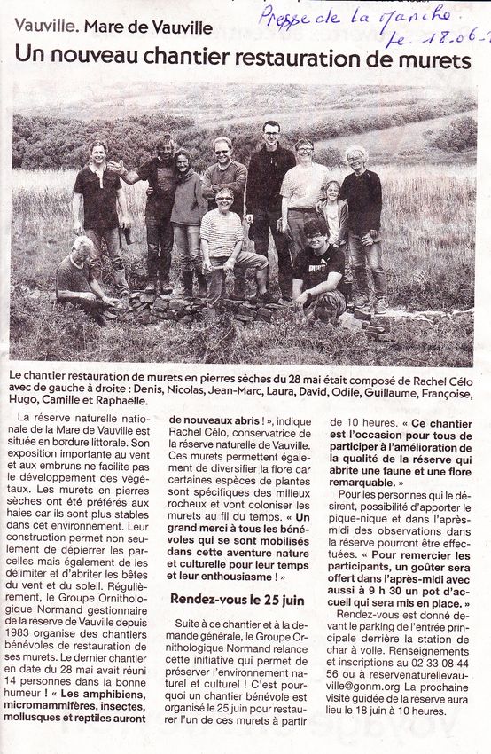 Ce chantier a réuni, le 28 mai 2016, 14 personnes qui ont restauré un des murets de la réserve nationale de Vauville. Ce type de chantier sera renouvelé le 25 juin : rendez-vous à 9h30 à l'entrée de la réserve.