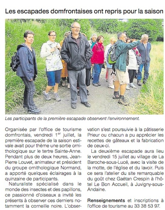 Notre collègue Jean-Pierre Louvet avait répondu à la demande de l'OT de Domfront-la-Poiraie (oui, c'est le nouveau nom de la commune...) pour animer une sortie à la découverte des oiseaux. Si le public fut enthousiasmé, on ne peut pas dire que le correspondant local ait appris grand chose, à part le nom de la corneille... Jean-Pierre aura au moins eu l'honneur d'être notre président le temps de la sortie!
