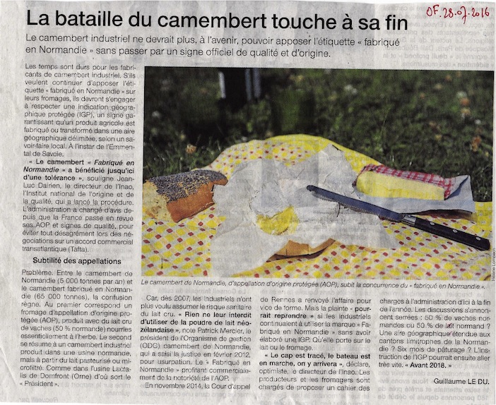 Au cas où vous seriez amateur de camembert (et de cidre), une information qui concerne tous les Normands (et bien sûr, au-delà!) : les producteurs de "camembert de Normandie" se battent contre les producteurs de "camembert fabriqué en Normandie". Nuance subtile qui change beaucoup de choses... Sans entrer dans les détails essentiels des cahiers des charges dont s'exonèrent les grands groupes industriels, pour nous naturalistes, il faut au moins retenir que le lait des "vrais" camemberts AOP est produit par des vaches qui vont au minimum 6 mois par an se nourrir dans une prairie et que l'agriculteur doit prévoir 2 ha de prairie pour 1 ha de maïs. Sans être des anti-maïs aveugles (nos refuges en fermes bio font la preuve qu'on peut produire du maïs intelligemment), on peut préférer le spectacle des merles chassant le lombric sur prairie. Et l'enquête "oiseaux des chaumes" menée par le GONm n'était pas enthousiasmante sur chaume de maïs...