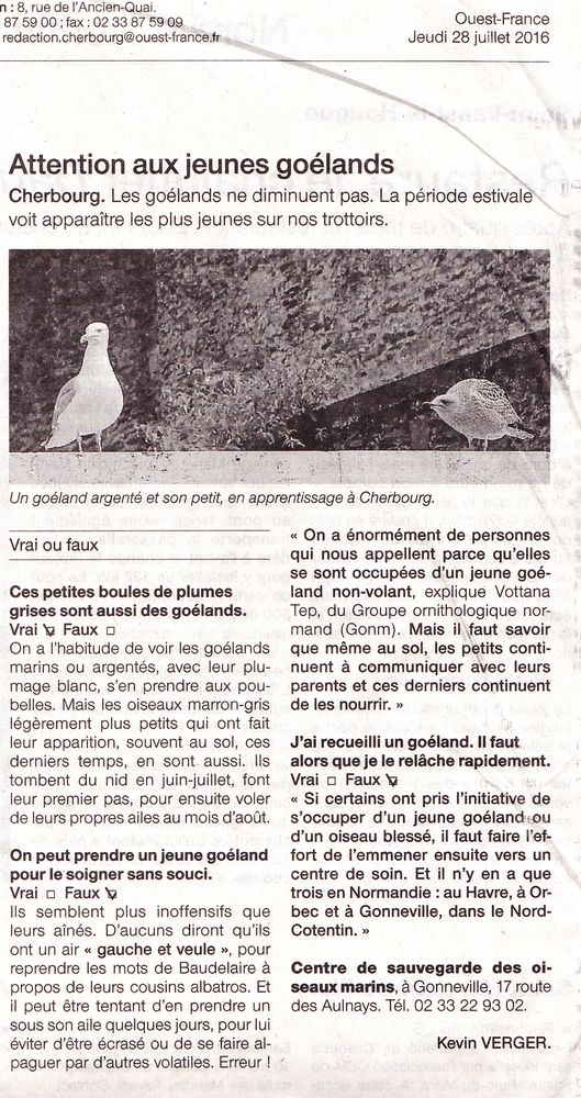 En quelques questions, cet article de Ouest-France nous indique, grâce aux discrets conseils du GONm, ce qu'il faut faire (ou ne pas faire) si l'on rencontre un jeune goéland errant sur les trottoirs de sa ville. Il rappelle en plus quels sont les centres de soins aux oiseaux existant en Normandie.