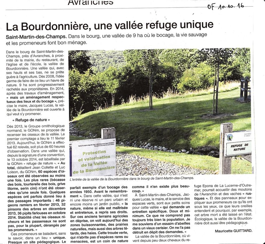 Cette vallée de la Bourdonnière a été aménagée en lieu de promenade par la commune de Saint-Martin des Champs. Cet espace est devenu un refuge de nature en 2015. Suite aux nombreux relevés effectués sur le site, le GONm et le maire de la commune ont convenu de la mise en place d'un parcours de découverte naturaliste, permettant aux promeneurs de mieux connaître la richesse des lieux. Voir aussi le message 389