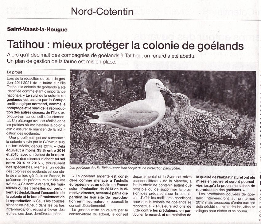 Voici un article de Ouest-France très éloquent à propos des goélands de Tatihou. Alors que la réserve gérée par la GONm n'existe plus et que le renard qui mettait en péril la colonie a été tué, le conseil départemental joue les "chevaliers blancs".