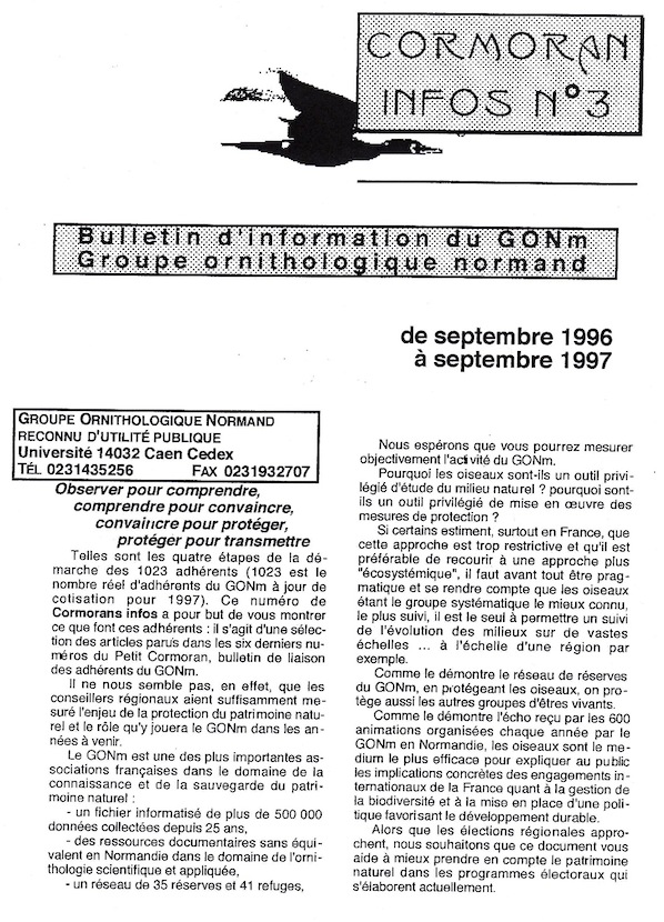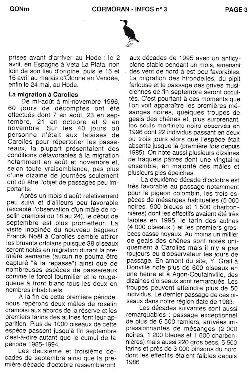 Le titre de ce 3e numéro est différent, de même que la pagination : 10 pages au lieu des 2 des numéros précédents. Gérard Debout tente de synthétiser l'activité de l'année passée à partir d'une sélection d'articles publiés dans le bulletin de liaison, le Petit Cormoran.