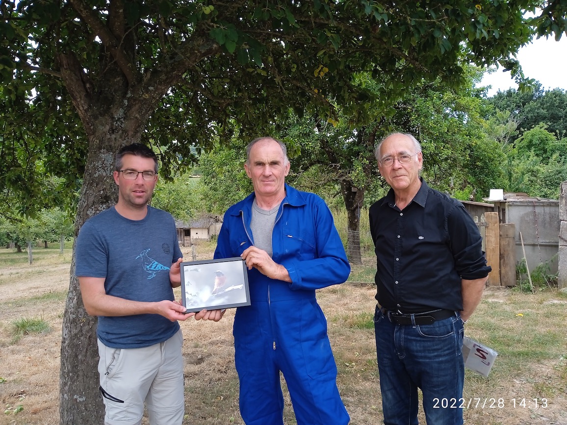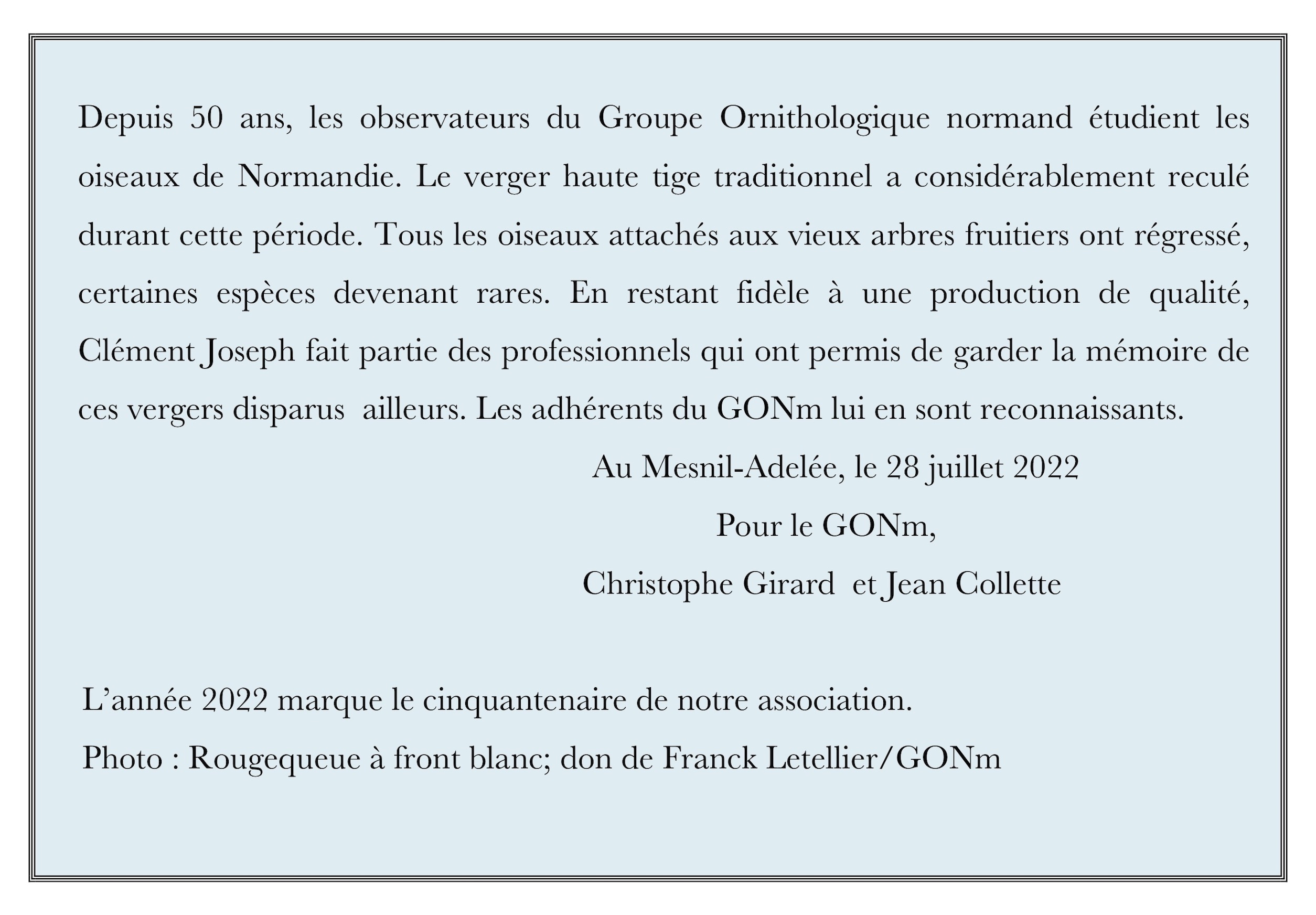 Producteur de cidre bio à partir d'un verger traditionnel haute tige, Clément Joseph défend un habitat régional original, et les oiseaux attachés aux vieux pommiers. Les rencontres proposées au cours de cette année particulière pour le GONm sont l'occasion de mettre en lumière le travail de ces cidriculteurs normands. Une photo de rougequeue à front blanc proposée par Jacques Rivière, a été offerte à Clément pour le remercier de sa collaboration à la sauvegarde de quelques espèces remarquables. Articles de presse sur ce forum, fil communication, message 1079